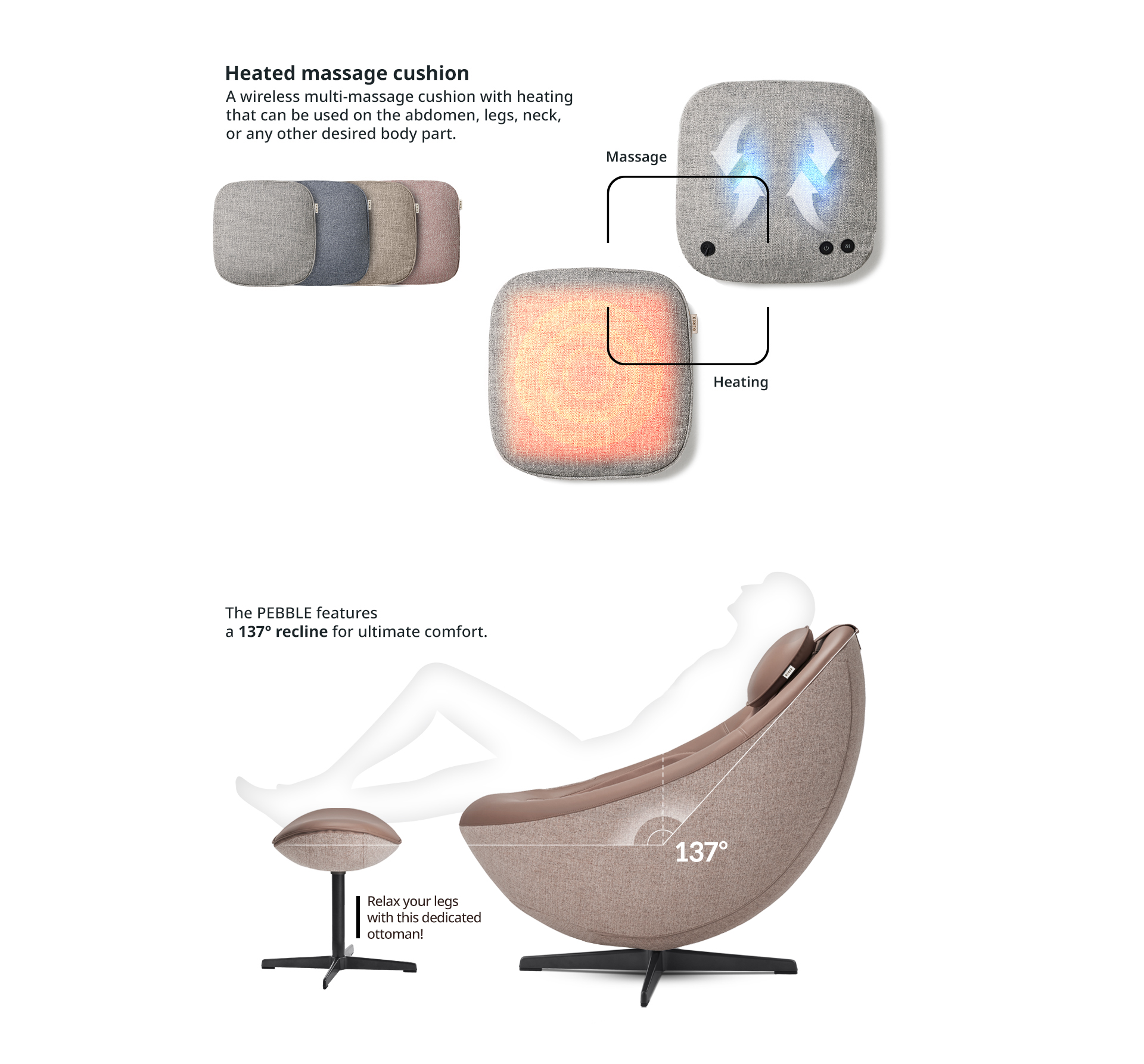 The hybrid design of PEBBLE discreetly integrates advanced massage features into the striking form of modern furniture, for a retreat into serenity and style within your home.